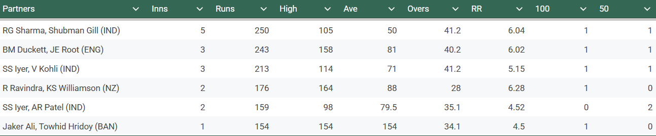 In the group stage match against New Zealand, he was India's best batter. He scored 79 runs of 98 balls. More importantly, he stitched two crucial partnerships with Axar and KL Rahul of respectively 98 and 44 runs. It helped India to reach a par total of 249 runs, eventually enough for India's win. Shreyas is also the only player in the tournament to be involved in two 150+ runs partnerships in the tournament. He has accumulated 159 runs with Axar and 213 runs with Virat Kohli. No other batter has been able to do it.